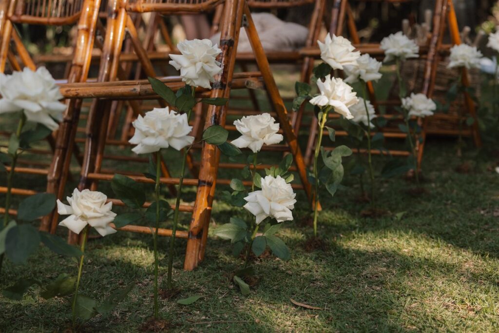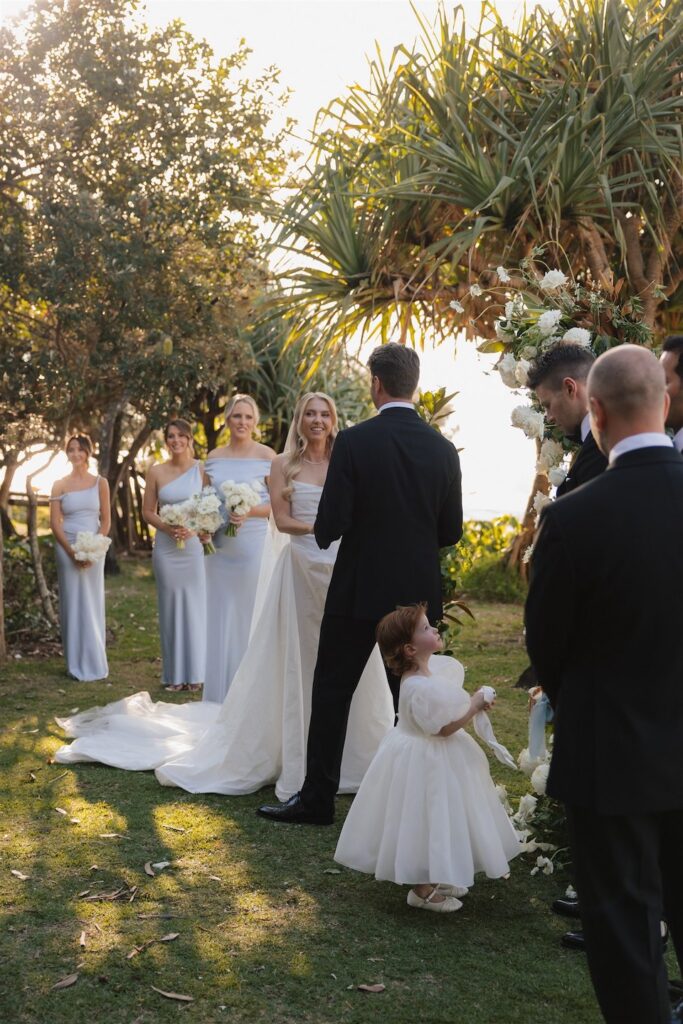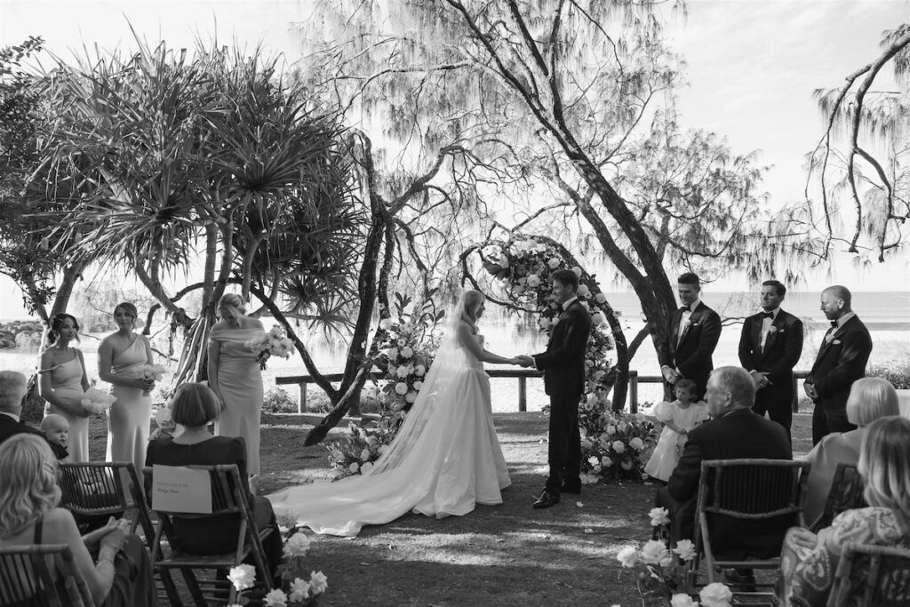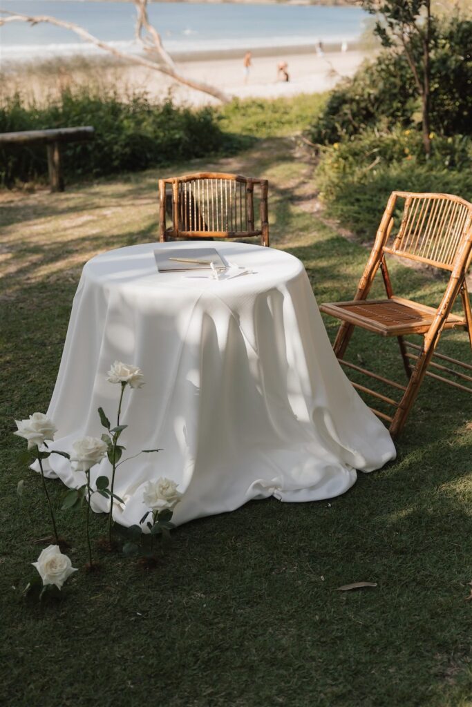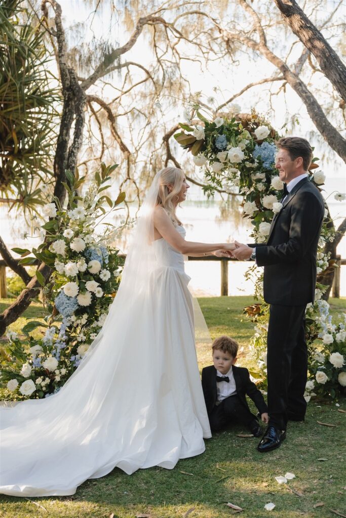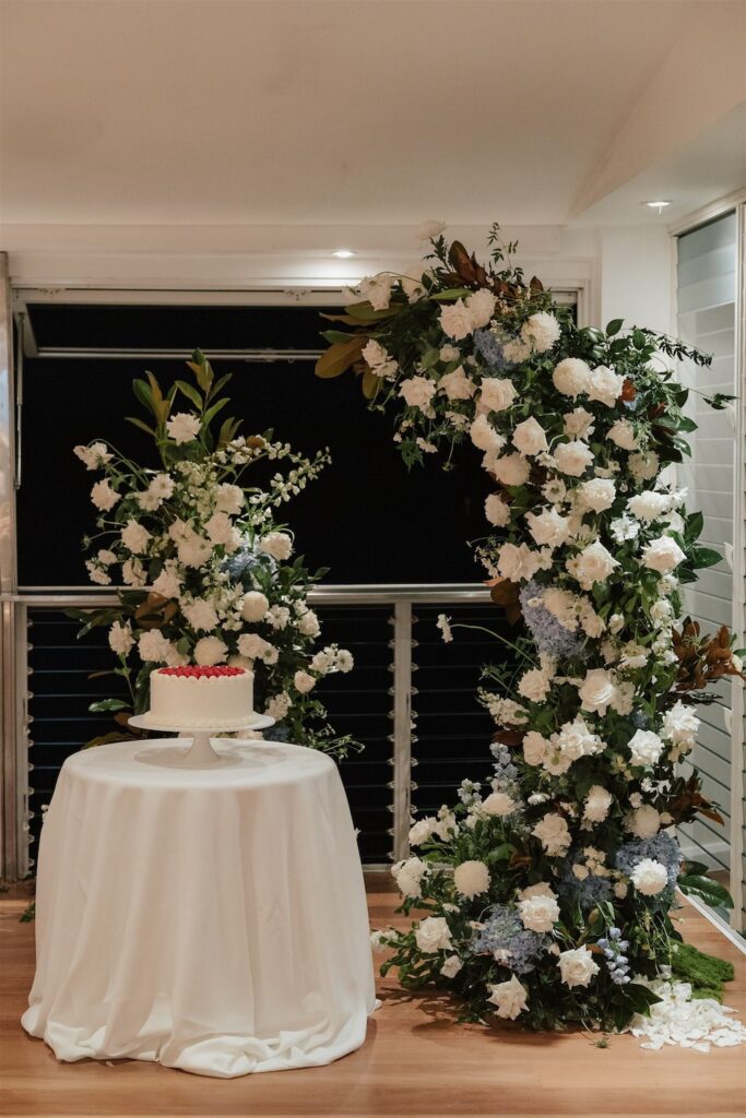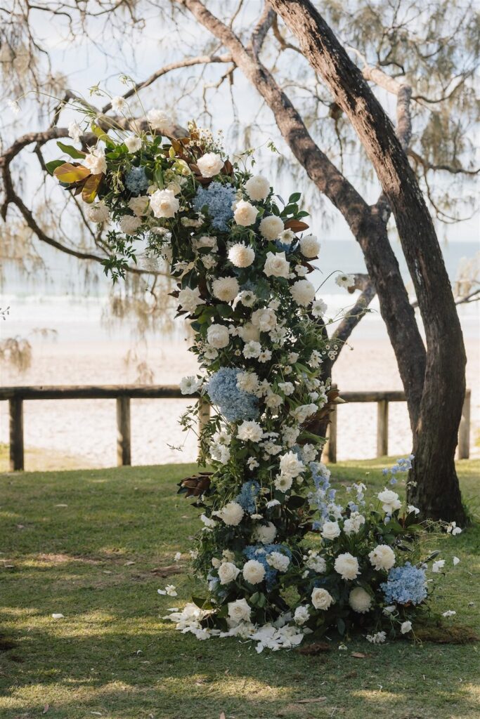 At the ceremony, two wild and rambling free-standing floral arrangements framed the couple, creating an “arbour-less” arbour that felt natural and romantic against the Noosa backdrop. A whimsical rose aisle of single cream and white rose stems scattered along the walkway completed the dreamy setting. These feature arrangements were later repurposed to the reception, creating a floral statement behind the cake table.