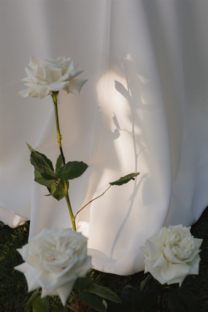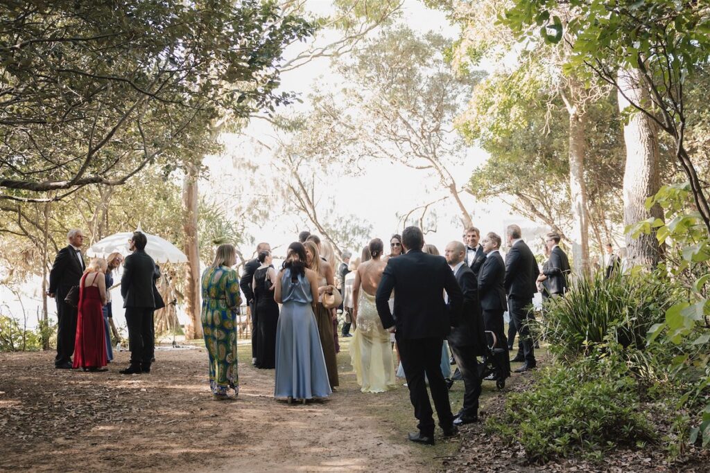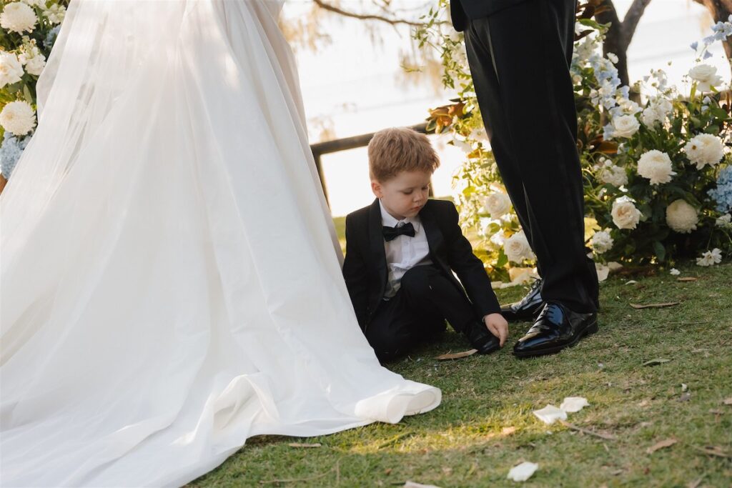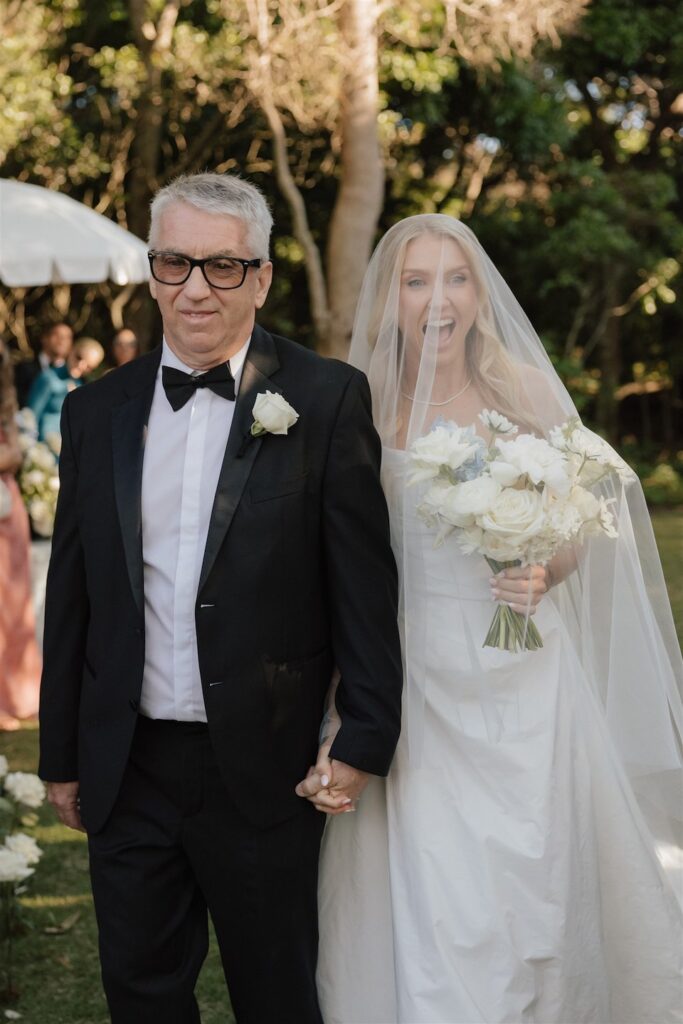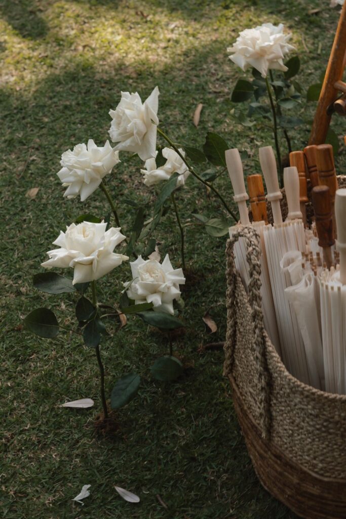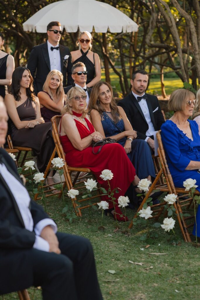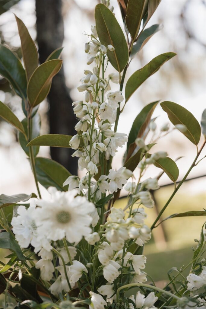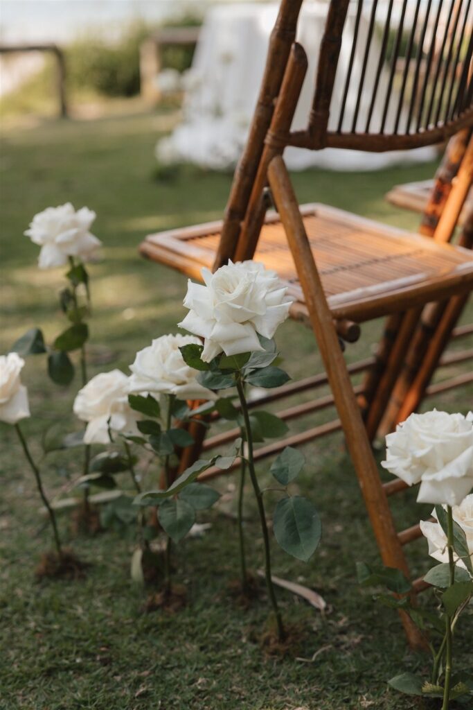 At the ceremony, two wild and rambling free-standing floral arrangements framed the couple, creating an “arbour-less” arbour that felt natural and romantic against the Noosa backdrop. A whimsical rose aisle of single cream and white rose stems scattered along the walkway completed the dreamy setting. These feature arrangements were later repurposed to the reception, creating a floral statement behind the cake table.