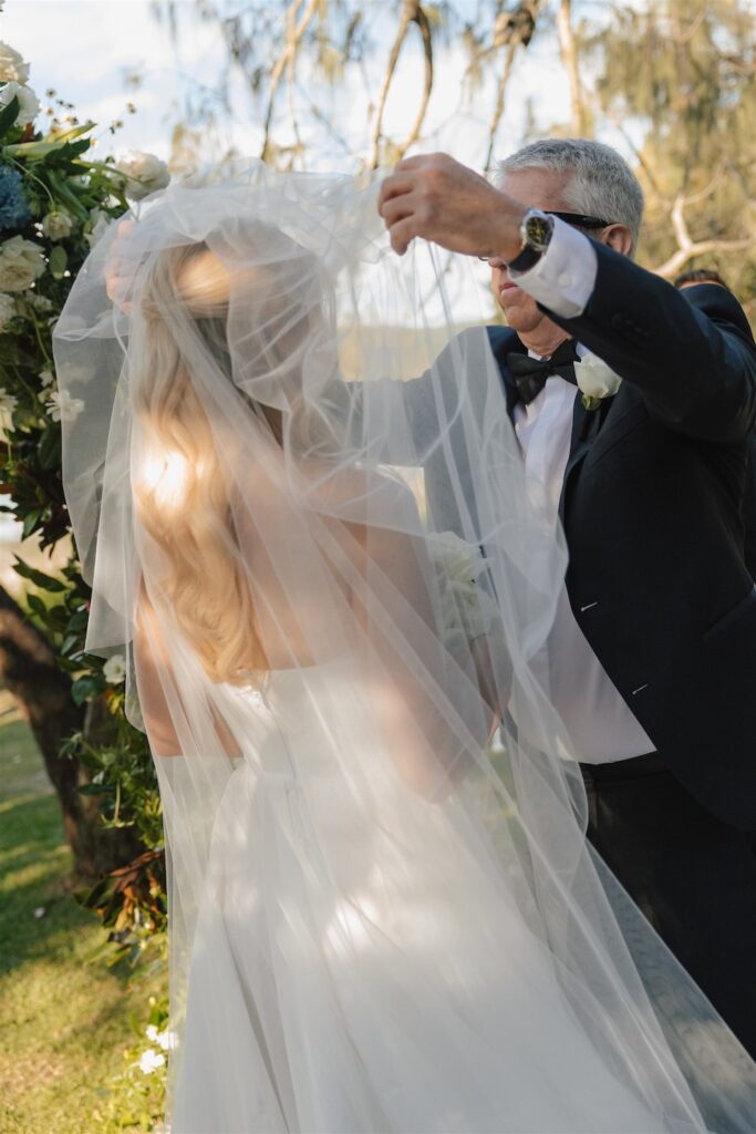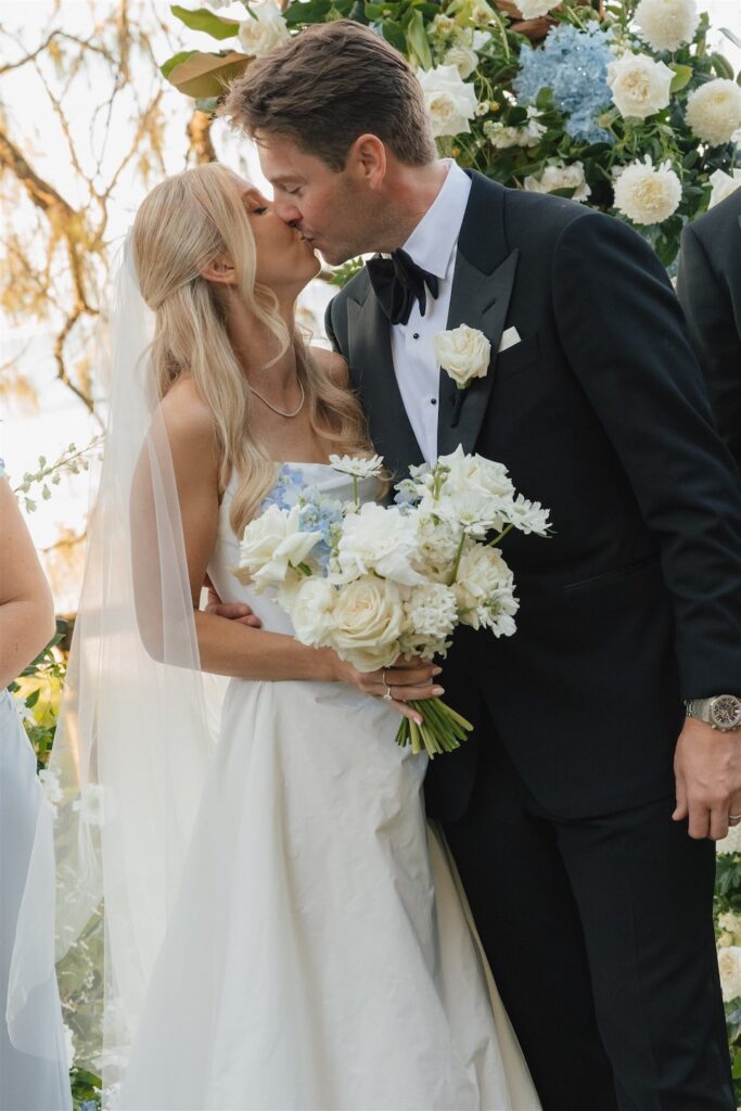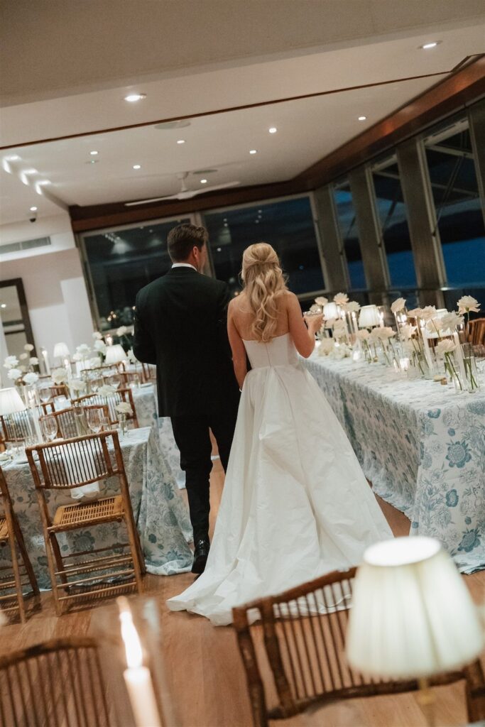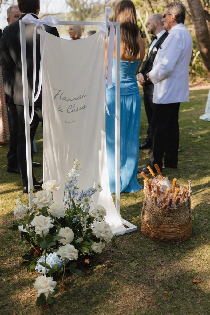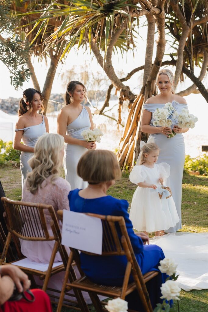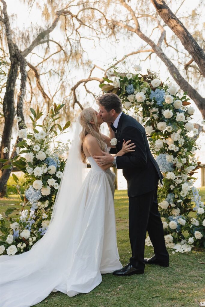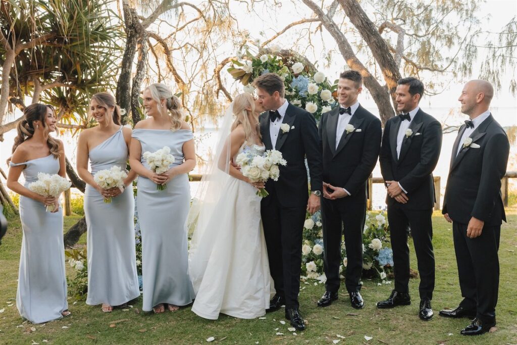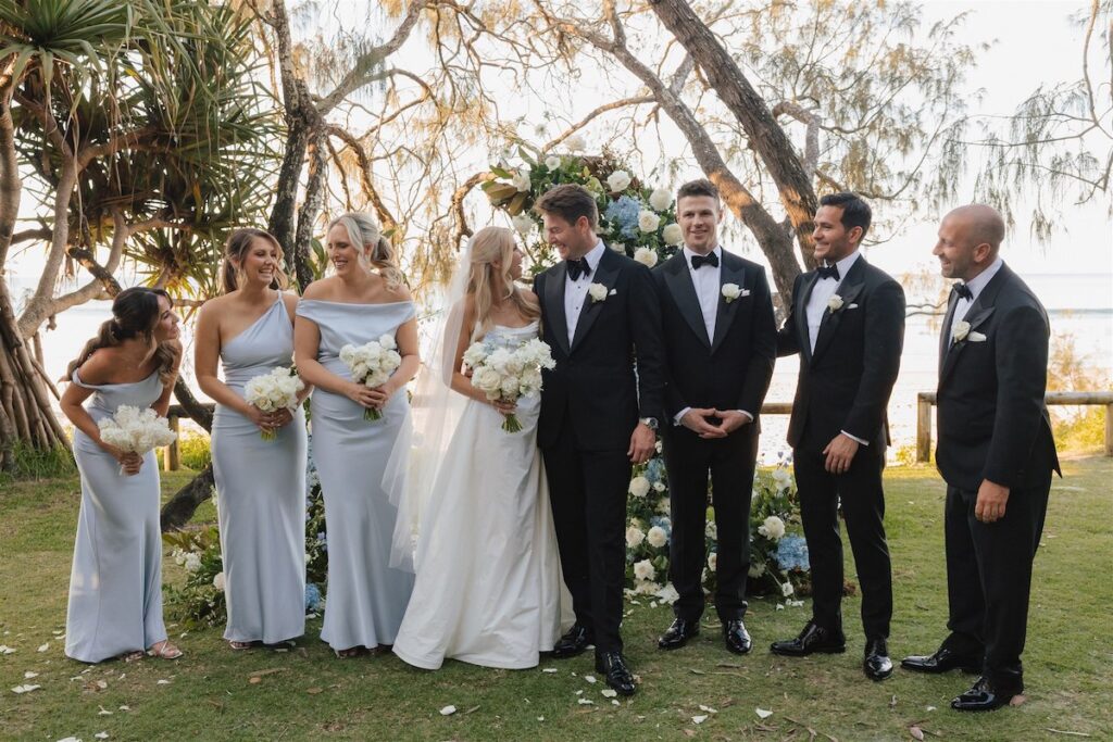 Hannah and Chris celebrated their stunning wedding with a ceremony at Hidden Grove, Noosa, followed by a chic reception at Ricky’s restaurant. The day embraced a Hamptons-inspired, black tie aesthetic with a soft and tranquil colour palette of light blue, cream and white.