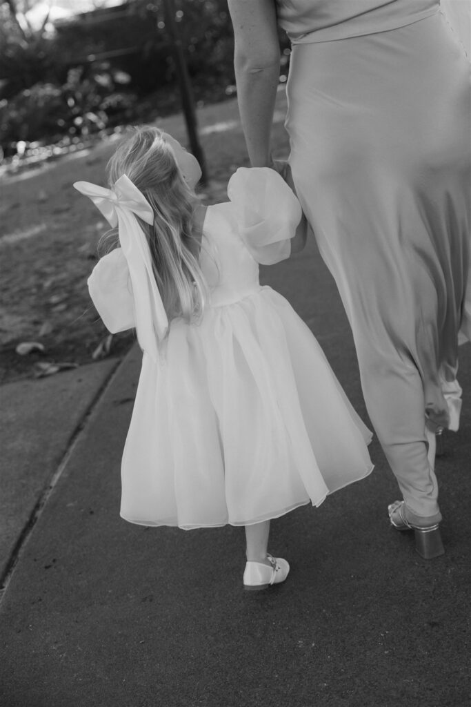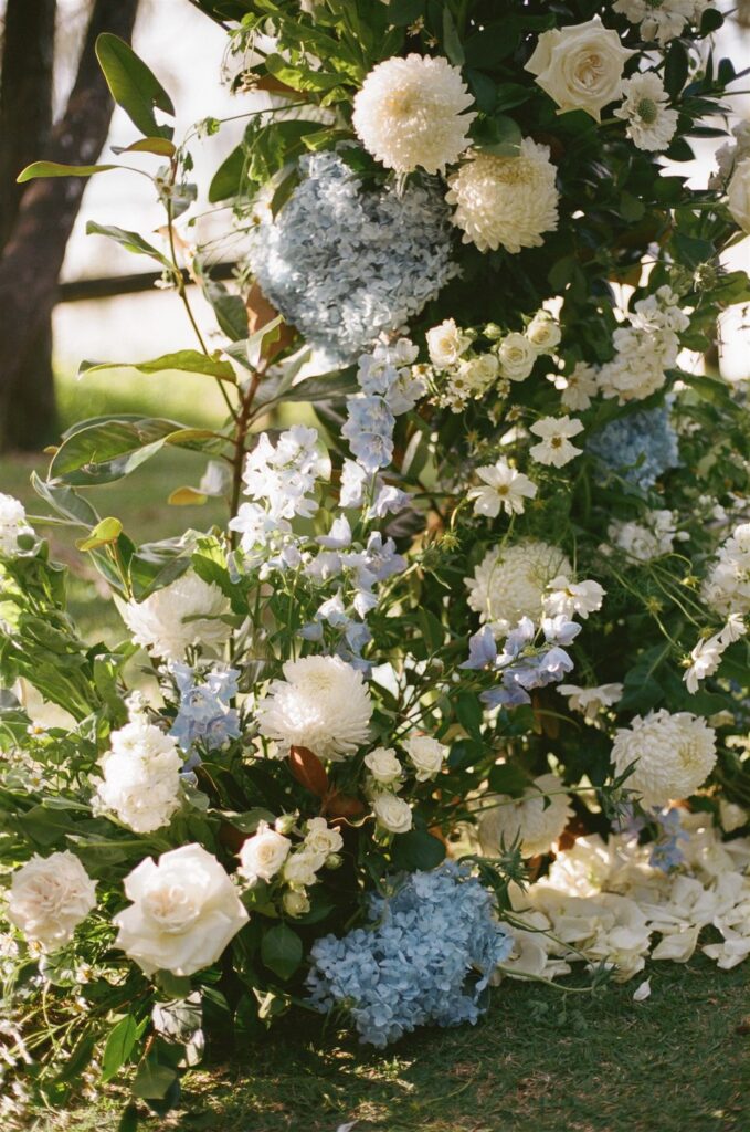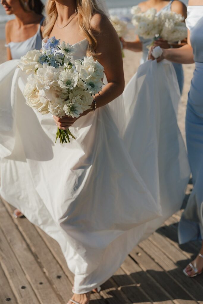 For the florals, we designed a blend of modern reflexed and cottage-style roses in whites and creams, paired with delphinium, hyacinth, tulips, cosmos, chamomile, stocks, preserved hydrangea, disbuds and spray roses, with a touch of glossy green foliage to complement. Hannah’s bridal bouquet was a dreamy mix of mostly white and cream blooms, with a subtle pop of blue for a timeless yet modern finish. Each bridesmaid carried a unique bouquet featuring a single variety of white blooms for an elegant, refined look to pair with their soft blue dresses.
