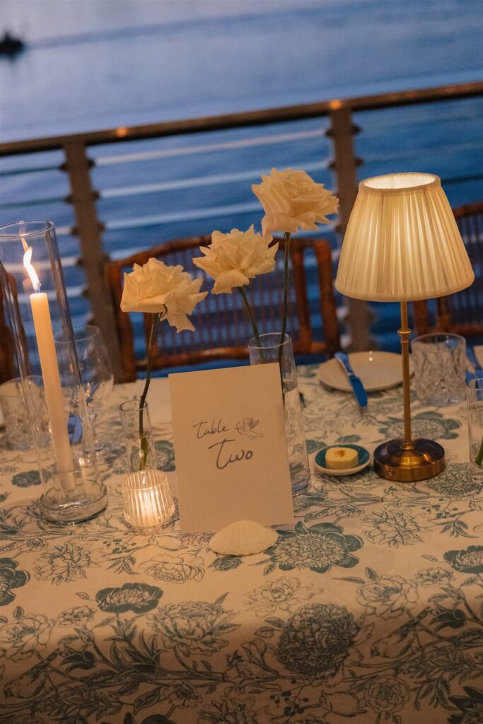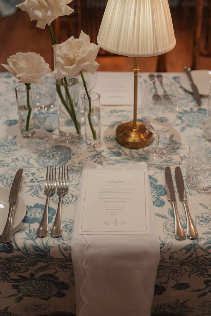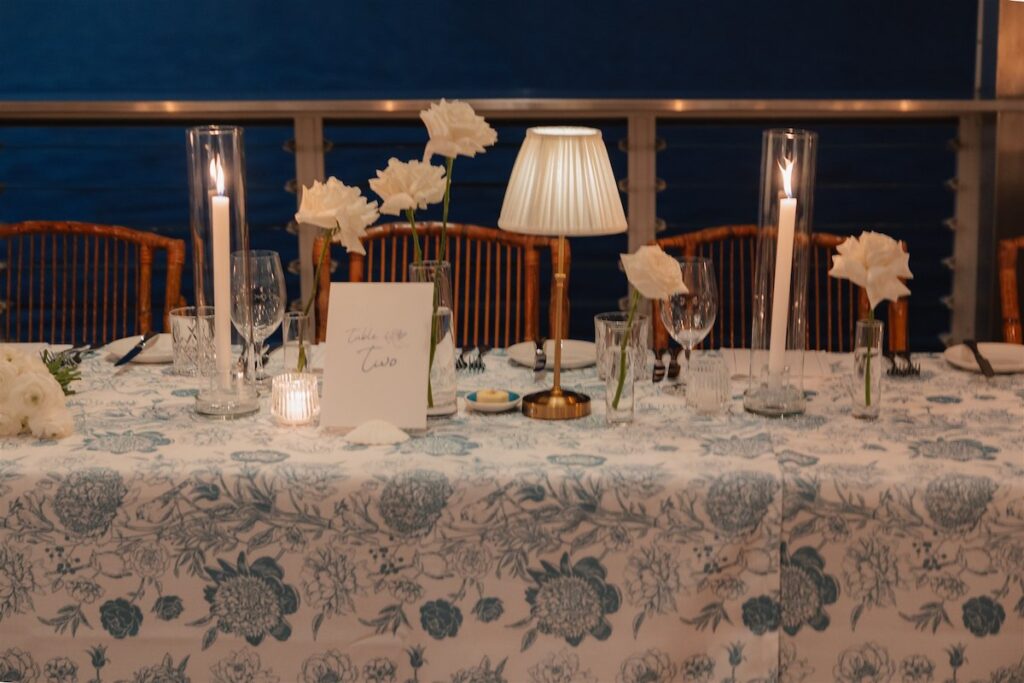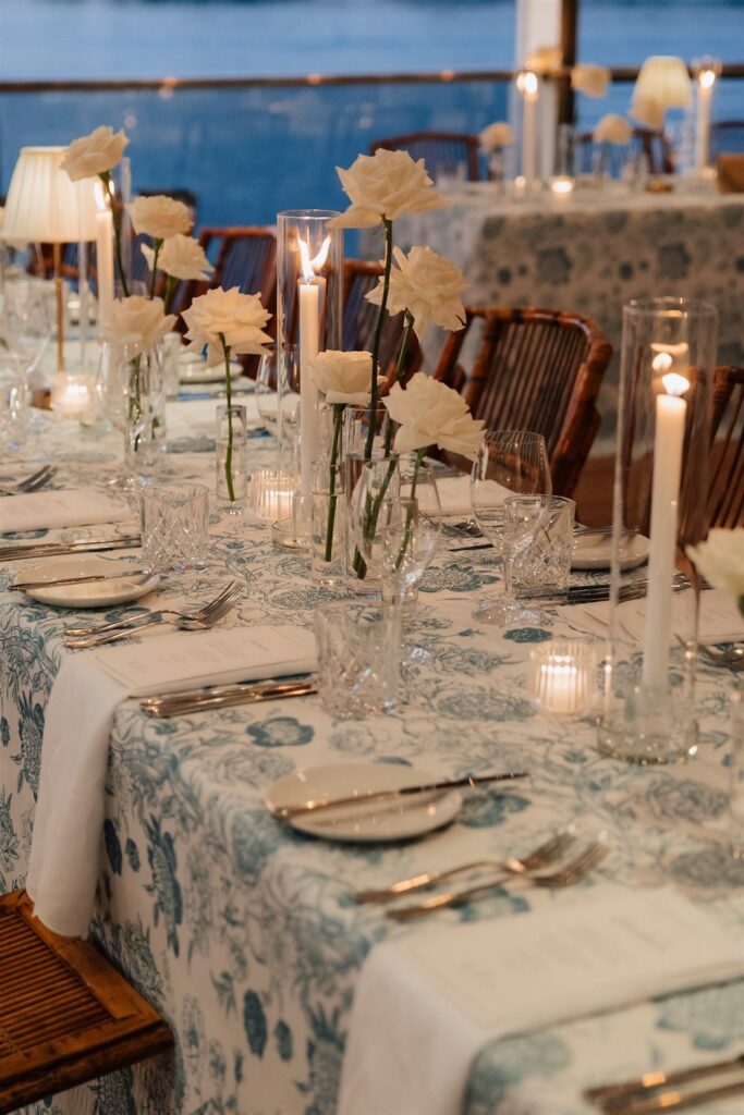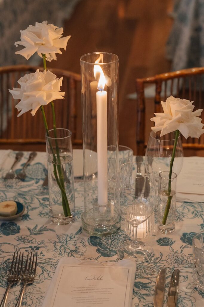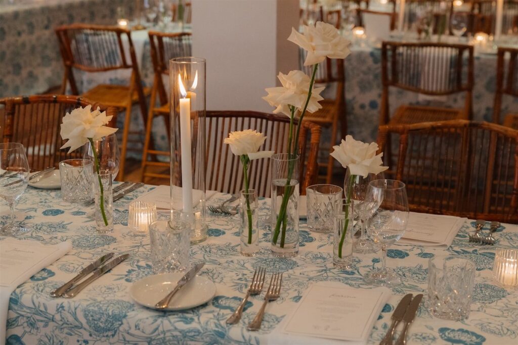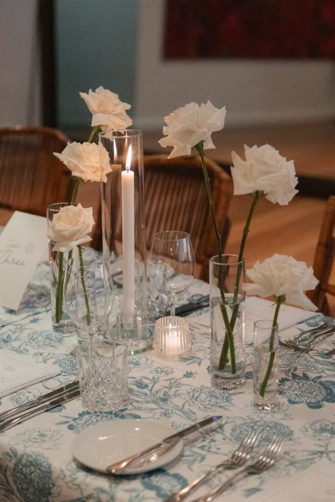 The reception tables were adorned with a beautiful white and floral table linen that paired perfectly with our clustered bud vase florals and flickering candlelight, creating a refined and intimate feel that complemented the Hamptons-chic styling.