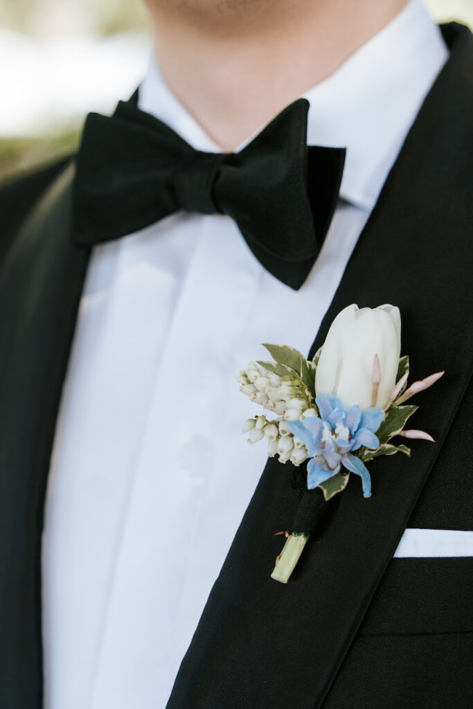 Down the aisle, white rose petals added a soft, romantic touch, while their reception tables were styled with mini floral bowl arrangements, bud vases and pillar candles, creating an intimate and inviting atmosphere.
