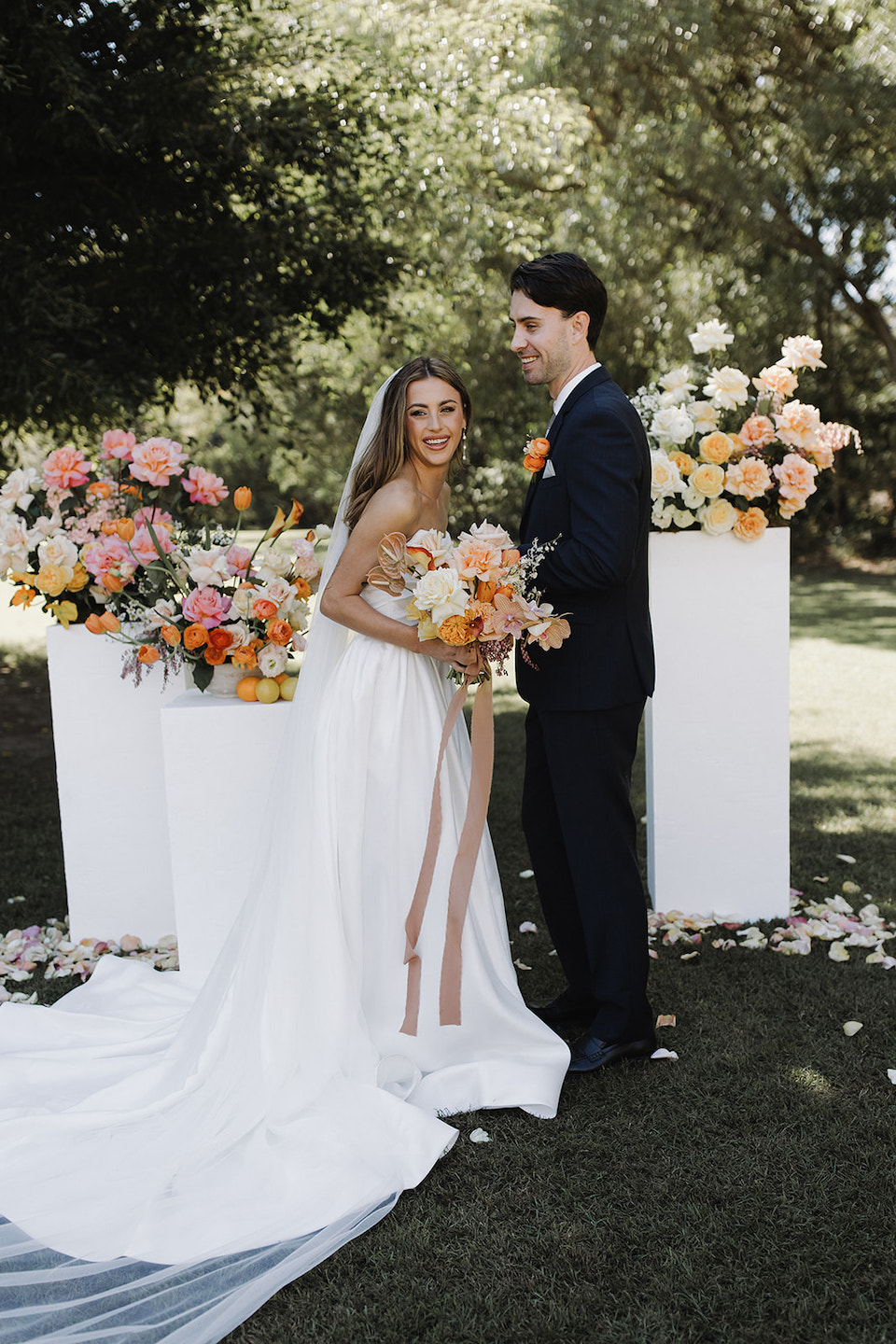 Bathed in sunlight, set in rugged bushland and softened by the lush blooms, this photoshoot encapsulates the Australian landscape and young love. We used a mass of pink plum and coral peonies, champagne lisianthus, Queen Anne’s Lace as well as an abundance of peach and cerise cottage roses teamed with birch, pepper tree, and privet...
