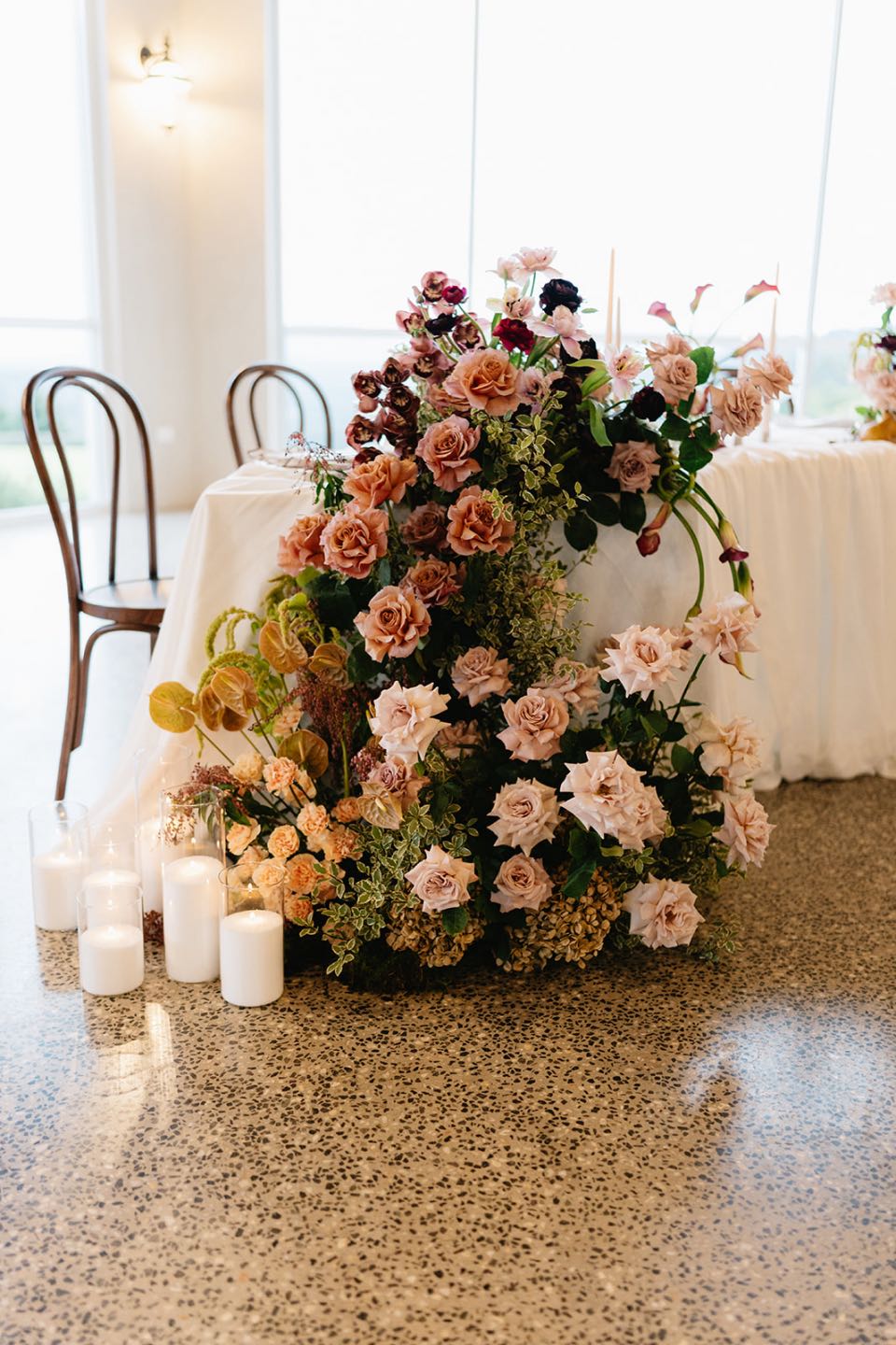 We got to work with some, arguably “the” best wedding vendors on the Sunshine Coast to create this sleek styled shoot and workshop for Shae Estella Photo. Massed roses in shades of mauve, blush and nude with a few under story blooms of tulips, stocks and sims. To pair with the crisp black and white...